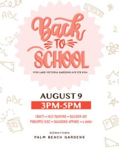 Join Downtown Palm Beach Gardens, Vagabond Apparel Kids, & Pineapple Kidz for a fun-filled Back to School Event this Saturday, August 9 from 3pm-5pm. Enjoy face painting, balloon art, a special appearance by Moana, kids’ crafts, great shopping and so much more!